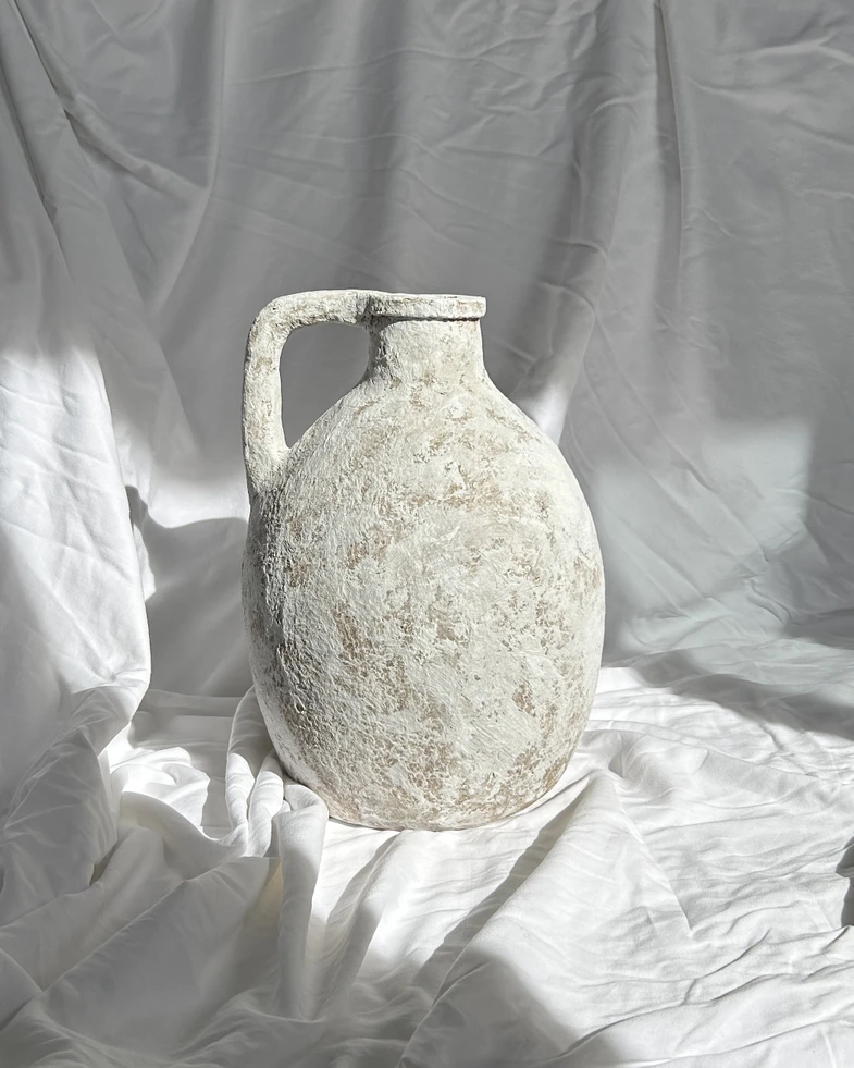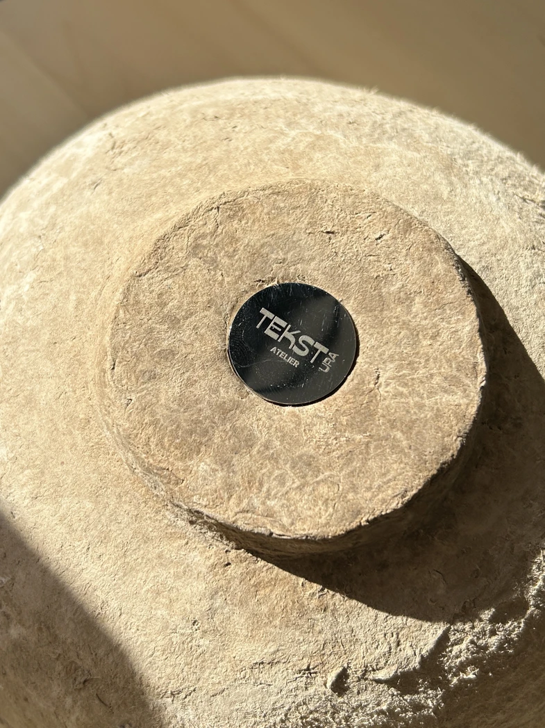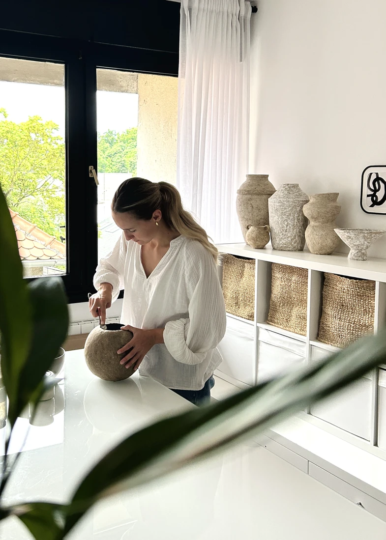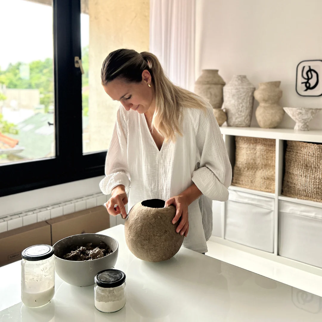 She makes vases and bowls using papier-mache technique, turning recycled paper into unique, handmade objects. Each piece is one of a kind. The aesthetic is natural materials, neutral colors, and irregular textures that resemble stone.